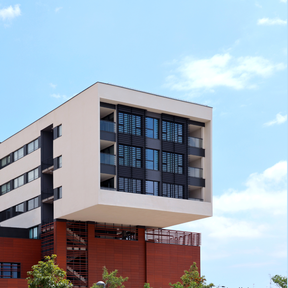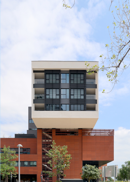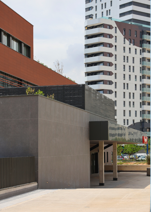 El diseño arquitectónico tiene raíces tradicionales mediterráneas, integrando terrazas ajardinadas y una fachada ventilada de arcilla, combinado con soluciones modernas para mejorar la eficiencia energética, resultando de ésta mezcla una certificación energética «A» con un consumo de sólo 74 kWh/m². Contribuyen a ésta eficiencia soluciones de protección solar como nuestros parasoles para hospitales de los que hablaremos hoy.