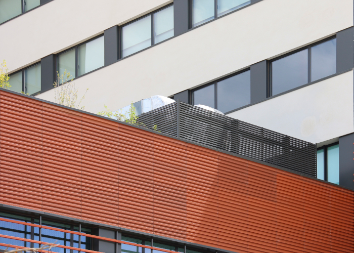 Respecto de las soluciones de cerramiento de máquinas, presentamos nuevamente una solución técnica, que debe cumplir con los requisitos de las máquinas en materia de ventilación y flujo de aire, y a la vez debe cumplir con las funciones estéticas de ocultación de vistas y diseño acorde al del edificio.